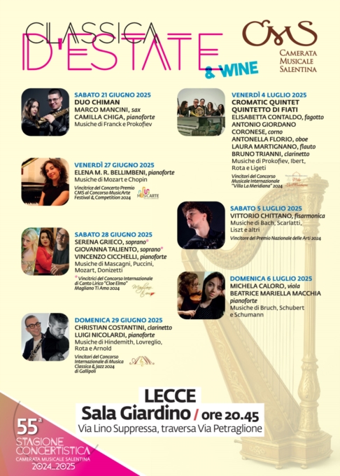 La rassegna, pensata per un pubblico curioso e appassionato, vuole valorizzare le eccellenze artistiche locali offrendo un’esperienza multisensoriale che unisce la bellezza della musica colta al piacere dell’enogastronomia di qualità. "Classica d’Estate & wine" è un invito a rallentare, a prendersi il tempo per ascoltare, degustare, emozionarsi. Un’occasione per vivere Lecce da una prospettiva nuova, sotto il segno della cultura e della bellezza.