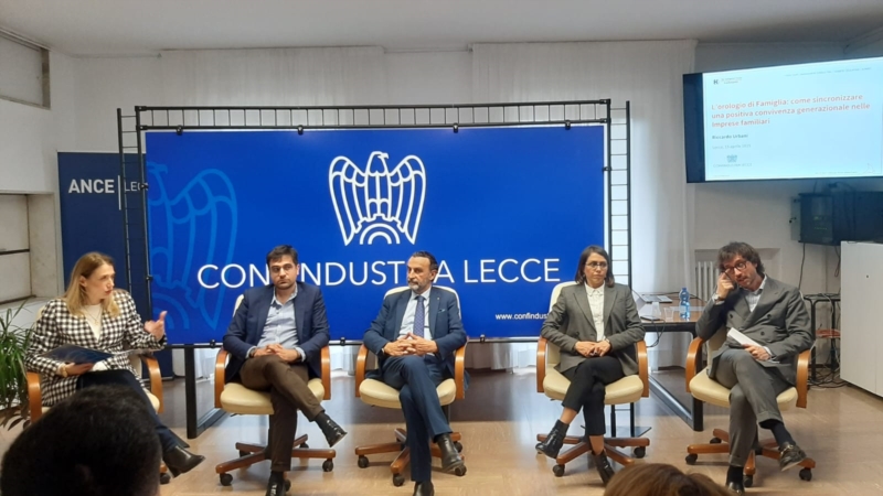 Un confronto diretto, concreto e ricco di stimoli quello che si è svolto ieri pomeriggio presso la sede di Confindustria Lecce in occasione dell’incontro riservato “L’orologio di famiglia: come sincronizzare una positiva convivenza generazionale nelle imprese familiari”, organizzato su iniziativa del Gruppo Giovani Imprenditori in collaborazione con TEHA Group – Ambrosetti.L’appuntamento ha rappresentato un momento di dialogo tra imprenditori ed esperti del settore, dedicato ad approfondire le dinamiche intergenerazionali nelle aziende familiari, con l’obiettivo di condividere strategie e strumenti utili per una governance efficace, sostenibile e orientata al futuro.