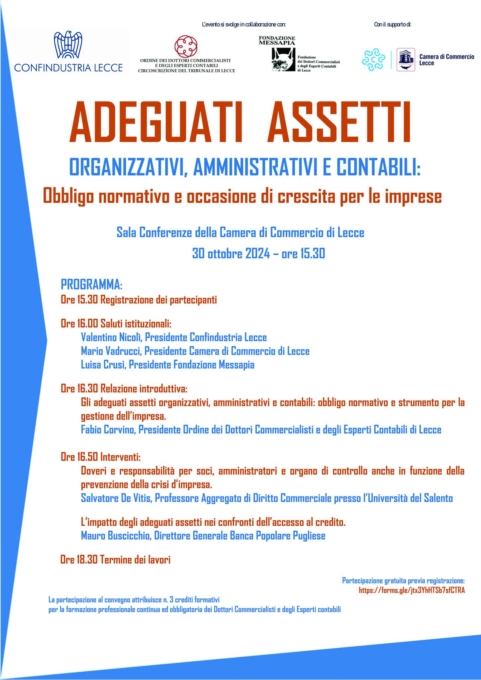Confindustria Lecce, in collaborazione con l’Ordine dei Dottori Commercialisti e degli Esperti Contabili di Lecce e la Fondazione Messapia, con il supporto della Camera di Commercio di Lecce, organizza il secondo appuntamento di approfondimento sul tema “Adeguati assetti organizzativi, amministrativi e contabili: applicazioni pratiche e casi di studio”, che si terrà martedì 6 febbraio alle ore 15.30 presso la Sala Conferenze della Camera di Commercio di Lecce.