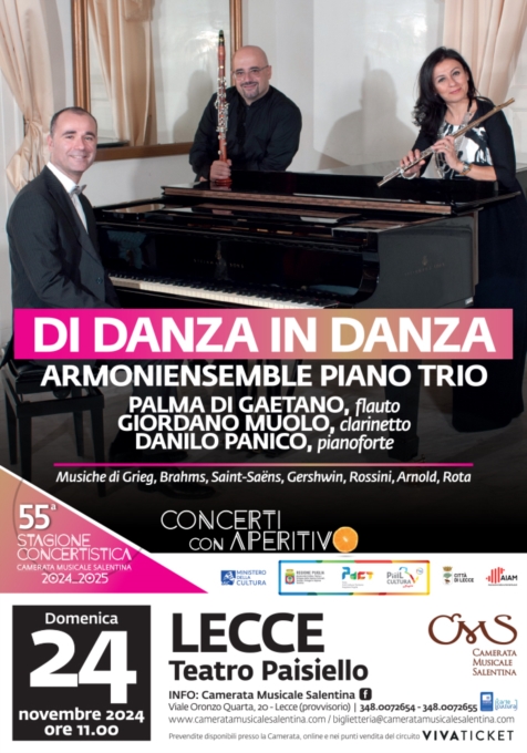 I Concerti con Aperitivo della Camerata Musicale Salentina continuano, domenica 24 novembre, con un trio cameristico inconsueto ma dal gradevolissimo impasto timbrico. Protagonista sul palco del Teatro Paisiello è l'ArmoniEnsemble Piano Trio, con Palma di Gaetano al flauto, Giordano Muolo al clarinetto e Danilo Panico al pianoforte, con musiche di Grieg, Brahms, Saint-Saëns, Gershwin, Rossini, Arnold e Rota.Il concerto, intitolato "Di danza in danza", propone brani appartenenti al repertorio classico e non, dal tipico carattere "danzante": un programma vivace e accattivante che, dalle danze Norvegesi di Grieg alla Danza Macabra di Saint Saëns, passando per le danze ungheresi di Brahms e la Tarantella di Gioacchino Rossini, approderà ad una simpatica Gran Fantasia e ad alcuni dei celebri brani del XX secolo di Gershwin e Nino Rota, arrangiati dagli stessi musicisti per flauto, clarinetto e pianoforte.