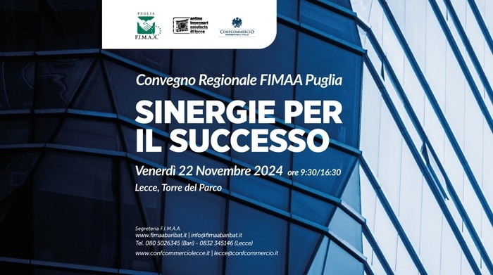Professionalità e networking, gli agenti Fimaa Puglia si ritrovano a Lecce il 22 novembreFIMAA Puglia, in collaborazione con le sezioni provinciali di Bari-BAT, Taranto, Lecce, Brindisi e Foggia, ha organizzato il convegno regionale "Sinergie per il Successo", il 22 novembre 2024 dalle 9.30 alle 16.30 all'hotel Torre del Parco (Viale Torre del Parco, 1) a Lecce.