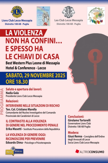 Il Lions Club Lecce Messapia organizza un convegno pubblico sul tema "La violenza non ha confini... e spesso ha le chiavi di casa", per sabato 29 novembre 2025 alle ore 18:30 presso il Best Western Hotel Leone di Messapia.L'iniziativa riunisce rappresentanti delle Forze dell'ordine, della Magistratura e dell'area psicologica per approfondire – con un approccio concreto – il tema della violenza domestica e delle sue molteplici forme.