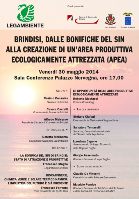 BRINDISI : dalle bonifiche del sin ad un'area produttiva ecologicamente attrezzata. Sarà questo il tema di un convegno organizzato da Legambiente Brindisi per Venerdì 30 Maggio 2014.Tra gli interventi quello di Giorgio Assennato, Dir. di ARPA Puglia e di Claudio De Vincenti Vice-Ministro allo Sviluppo Economico.