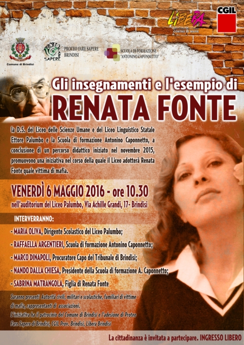 Venerdi, 6 maggio 2016, alle ore 10,30 il Liceo Palumbo di Brindisi e la Scuola di Formazione Antonino Caponnetto,a conclusionedi un percorso didattico iniziato nel novembre 2015, promuovono una iniziativa dal titolo "Gli insegnamenti e l'esempio di Renata Fonte"