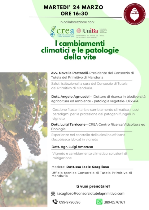 Il Consorzio di Tutela del Primitivo di Manduria organizza per martedì 24 marzo alle ore 16:30 un importante incontro dedicato a un tema sempre più centrale per il settore vitivinicolo: i cambiamenti climatici e le patologie della vite.L'iniziativa si terrà presso l'Aula "Gabriella Fanuli" del Consorzio di Tutela del Primitivo di Manduria, in via Masseria Le Fiatte 1, Uggiano Montefusco – Manduria (TA), ed è realizzata in collaborazione realizzata con il CREA di Turi e l'Università degli Studi di Bari Aldo Moro – Dipartimento di Scienze del Suolo, della Pianta e degli Alimenti (DiSSPA), si propone di approfondire le nuove sfide che il vigneto si trova ad affrontare e le possibili strategie di gestione e mitigazione. L'evento rappresenta un'occasione di aggiornamento per gli operatori del settore, con l'obiettivo di fornire strumenti concreti per affrontare le criticità legate al clima e alla sanità della vite.