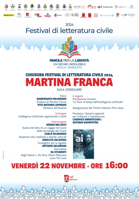 Gran finale per "Il Festival di Letteratura Civile 2024 - Parole per la Libertà" organizzato da ERF Edizioni con la tappa conclusiva in Valle d'Itria, a Martina Franca (Ta). Appuntamento in Aula Consiliare venerdì 22 novembre alle ore 16,00.L'incontro a chiusura de Festival, che ha toccato i presidi scolastici di 25 Comuni pugliesi in tutte le 6 province - con oltre 40 istituti scolastici, 280 classi e più di 6000 studenti coinvolti - tirerà le somme anche del Contest lanciato in collaborazione con l'Amministrazione Comunale e tre istituti superiori di Martina Franca, per complessive sei classi, il cui tema proposto è stato: 'LA PACE AL TEMPO DELL'INTELLIGENZA ARTIFICIALE'.