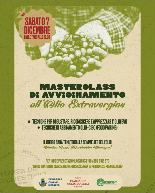 Il corso gratuito ha come obiettivo quello di insegnare le tecniche per degustare, riconoscere e apprezzare l’olio Evo e abbinarlo correttamente al cibo. La Masterclass sarà tenuta dalla Sommelier dell’olio Marina Roma. La classe prevista è a numero chiuso, max 15 persone, su prenotazione.