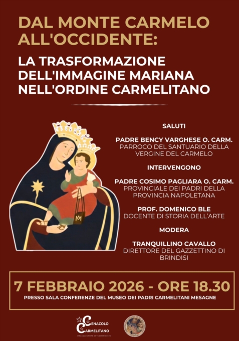 Sabato 7 febbraio, alle ore 18.30, la sala riunioni del Museo dei Padri Carmelitani di Mesagne ospiterà un incontro di alto profilo culturale e spirituale dal titolo “Dal Monte Carmelo all’Occidente: la trasformazione dell’immagine Mariana nell’Ordine Carmelitano”. Un appuntamento pensato per approfondire le radici storiche, teologiche e artistiche di una delle devozioni più sentite e diffuse della tradizione cristiana.Dopo i saluti introduttivi del parroco, padre Bency Varghese, i lavori entreranno nel vivo con gli interventi di padre Cosimo Pagliara, padre provinciale dei Carmelitani dell’Antica Osservanza, e del professor Domenico Ble, docente di Storia dell’arte e profondo conoscitore delle dinamiche iconografiche legate al culto mariano. A moderare la conferenza sarà il giornalista Tranquillino Cavallo, che accompagnerà il dialogo tra i relatori e il pubblico.