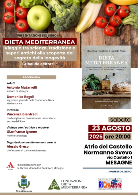 Il prossimo 23 agosto si svolgerà a Mesagne la presentazione del libro “Dieta Mediterranea. Viaggio Dieta Mediterranea. Viaggio tra scienza, tradizione e sapori antichi alla scoperta della longevità”, Gribaudo Editore, con l’autrice Vincenza Gianfredi, medico igienista e professoressa universitaria, distintasi per importanti studi epidemiologici condotti su tale modello nutrizionale e comportamentale. All’iniziativa prenderanno parte anche il sindaco di Mesagne, Toni Matarrelli, da sempre sensibile ai temi dei corretti stili di vita, e il segretario generale della Fondazione Dieta Mediterranea, Domenico Rogoli, biologo nutrizionista molto attivo nella promozione dell’educazione alimentare nelle scuole, che porteranno il proprio saluto. Sarà lo chef Alessio Greco a curare una particolare degustazione mediterranea, proponendo innovazioni gastronomiche all’insegna della tradizione. A moderare l’incontro sarà Gianfranco Ignone, medico cardiologo, da sempre in prima linea nel favorire l’adozione di stili di vita sani e sostenibili tra i propri pazienti, in quanto rappresentano le principali strategie di prevenzione e di cura per quelle patologie non trasmissibili che colpiscono in particolar modo le popolazioni occidentali, tra cui malattie cardiovascolari, diabete, obesità, tumori, demenze e degenerazioni osteo-articolari. L’evento si svolgerà presso l’atrio del Castello Normanno-Svevo alle ore 20:00 ed è organizzata dalla Fondazione Dieta Mediterranea in collaborazione con l’associazione di promozione sociale RiCreAzione, la libreria Mondadori Bookstore Mesagne, e patrocinata dalla Città di Mesagne. L’ingresso è libero.