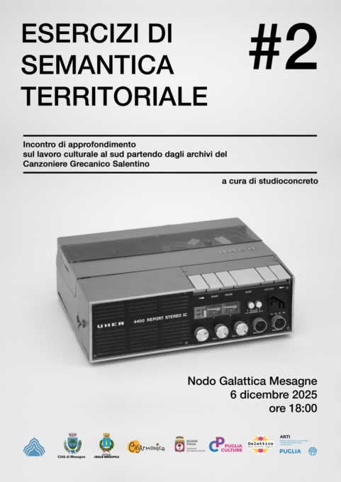 Il Nodo Galattica di Mesagne si prepara a ospitare un incontro di grande rilevanza culturale: "Esercizi di Semantica Territoriale #2", a cura di Luca Coclite e Laura Perrone (studioconcreto). L'appuntamento è per le ore 18:00 presso gli spazi di Lab Creation in via Lucantonio Resta 15, nel cuore del centro storico. L'ingresso è gratuito, ma la prenotazione è obbligatoria.Questo evento rappresenta un'opportunità unica per esplorare, attraverso gli archivi del Canzoniere Grecanico Salentino, la storia del lavoro culturale nel Salento. Il seminario trae origine dalla recente ricerca del duo artistico-curatoriale, presentata nella mostra "Il Mito – Unconventional Archive" (Melpignano, 29 giugno - 17 agosto 2025), inaugurata per celebrare il cinquantesimo anniversario del Canzoniere Grecanico Salentino.
