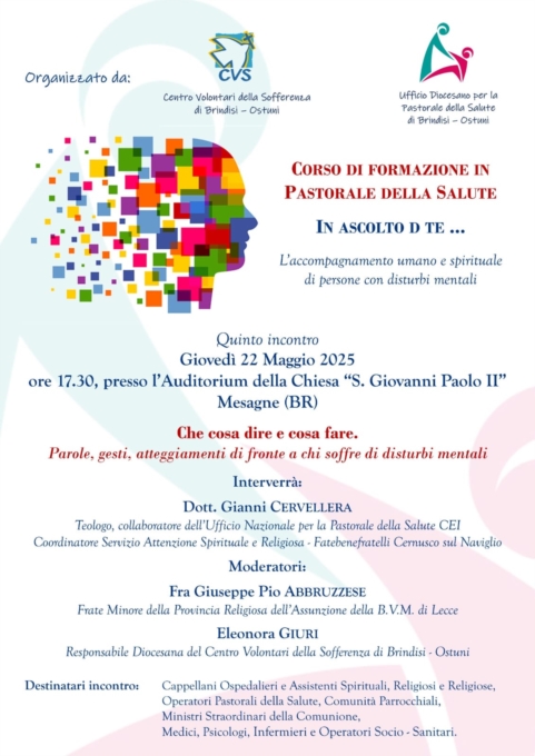 Prosegue con il quinto appuntamento il ciclo di incontri del Corso di Pastorale della Salute promosso dal Centro Volontari della Sofferenza di Brindisi-Ostuni e dall’Ufficio Diocesano per la Pastorale della Salute dell’Arcidiocesi di Brindisi – Ostuni, con il patrocinio dell’Ufficio Nazionale per la Pastorale della Salute della CEI, dei Silenziosi Operai della Croce e in collaborazione con l’Editoriale Romani.Il penultimo incontro del percorso, intitolato “In ascolto di te... L’accompagnamento umano e spirituale di persone con disturbi mentali”, si terrà giovedì 22 maggio 2025 alle ore 17.30, presso l’Auditorium della Chiesa “San Giovanni Paolo II” a Mesagne (BR).