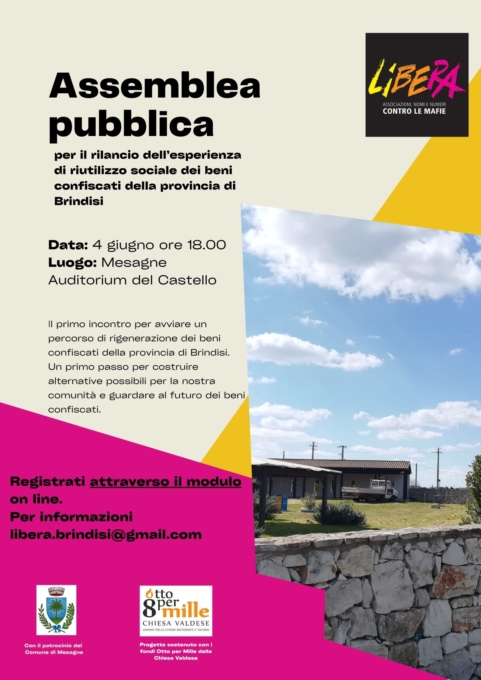 Il 4 giugno 2025 alle ore 18 presso l’Auditorium del Castello di Mesagne si terrà la prima assemblea pubblica, il primo passo per affrontare insieme la sfida per la nostra comunità e guardare al futuro dei beni confiscati in oggetto.