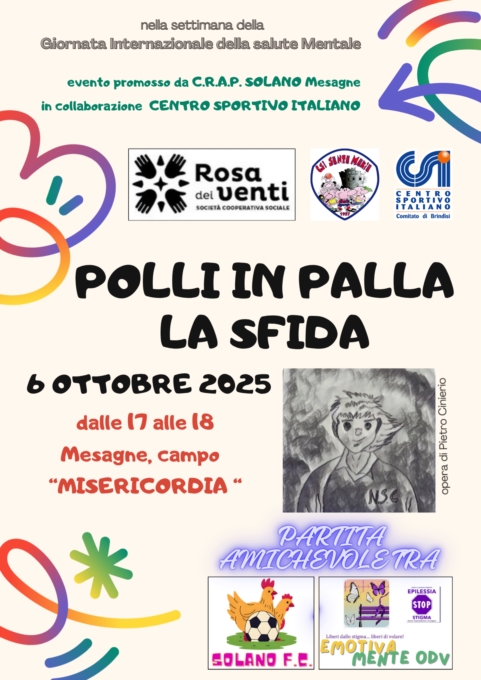 Nella settimana in cui ricade la “Giornata Internazionale della Salute Mentale”, il 6 ottobre alle ore 17 presso il campo de “La Misericordia” di Mesagne avrà luogo la partita amichevole di calcetto tra gli ospiti dellaC.R.A.P. “SOLANO” e i volontari di EMOTIVA...MENTE (organizzazione di volontariato impegnata contro lo stigma che penalizza le persone affette da epilessia). L’iniziativa è sostenuta anche dal Centro Sportivo Italiano - comitato di Brindisi.