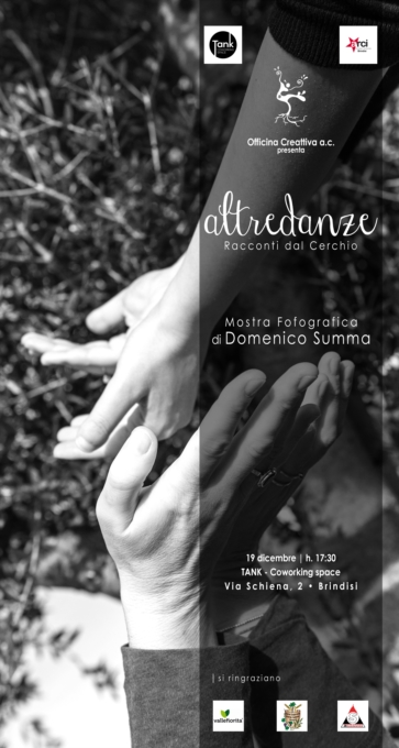L’appuntamento è per sabato 19 dicembre ’15, dalle ore 17:30, al TANK – coworking space di Brindisi, in via Schiena 2, per l’inaugurazione della Mostra Fotografica ALTREDANZE.Chiara Sergio, direttrice artistica dell’associazione culturale Officina Creattiva, di Brindisi, presenta, attraverso gli scatti di Domenico Summa, gli studi e i laboratori di Danze Creative, Danze d’Arte e di Cura.