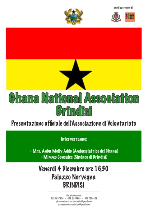 La Comunità dei cittadini Ghanesi presenti nella nostra città organizza per Venerdì 4 Dicembre alle ore 16,30 alla sala conferenze di Palazzo Nervegna un incontro pubblico in cui presentare la nascita della associazione di volontariato “Ghana National Association Brindisi”.Interverrà l’Ambasciatrice del Ghana la signora Anim Molly Abbo,