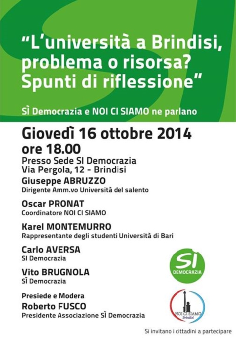 GIOVEDI 16 OTTOBRE 2014 presso la sede di SI DEMOCRAZIA in BRINDISIalla Via Pergola n.12 si parlerà dei PROBLEMI DELL'UNIVERSITA' insieme ai giovani del MOVIMENTO NOI CI SIAMO.