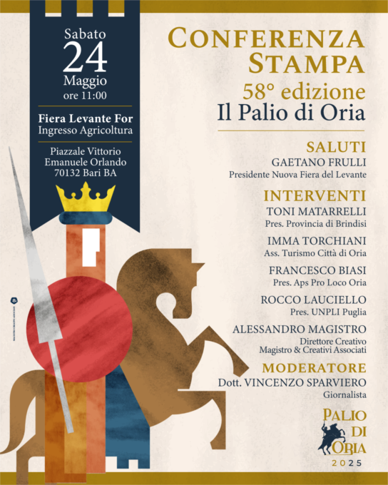 L'APS Pro Loco di Oria è lieta di annunciare il ritorno del celebre Palio di Oria, giunto alla sua 58ª edizione. L'appuntamento, che si svolgerà dal 31 luglio all'11 agosto 2025, riporterà la cittadina pugliese in provincia di Brindisi al centro di un affascinante evento storico e culturale, capace di coinvolgere visitatori di ogni età.L'evento, come ogni anno, celebra un momento storico di grande rilievo: il passaggio da Oria insieme alla sua corte, di Federico II di Svevia, uno dei sovrani più illustri del Medioevo, avvenuto nel 1225, in attesa del suo matrimonio con Jolanda di Brienne. In quell'occasione, per festeggiare, l'imperatore bandì un torneamento tra i quattro Rioni della Città (Castello, Judea, Lama e Santo Basilio), evento che ha ispirato poi la tradizione del Palio di Oria.