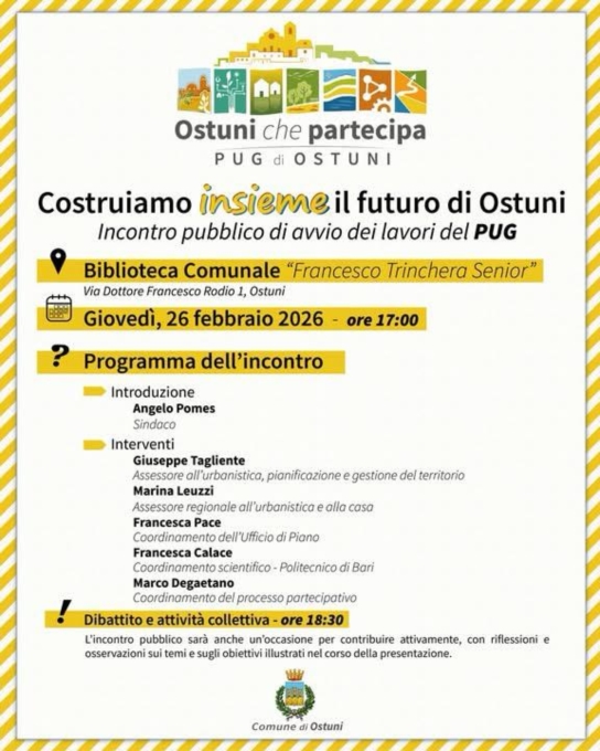 Con Deliberazione della Giunta Comunale n. 268 del 30 ottobre 2025 è stato approvato l’“Atto di indirizzo per l’avvio del procedimento del Piano Urbanistico Generale di Ostuni”, documento che definisce gli obiettivi strategici e le linee guida che orienteranno le future scelte di pianificazione. A partire da tale atto, l’Amministrazione comunale promuove un primo incontro pubblico di presentazione e confronto, finalizzato alla condivisione degli indirizzi strategici e all’avvio di un percorso realmente partecipativo.L’incontro si terrà Giovedì 26 febbraio 2026 alle ore 17:00 presso la Biblioteca Comunale “Francesco Trinchera Senior”, e rappresenterà il momento inaugurale di un cammino che coinvolgerà cittadini, associazioni, professionisti, imprese e tutti i portatori di interesse.