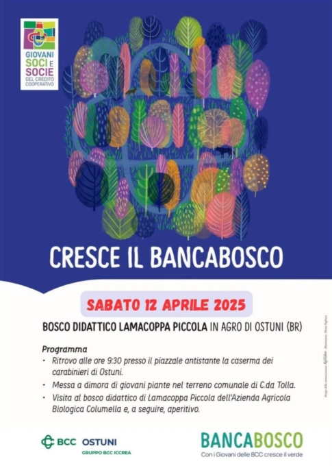 Sabato 12 aprile il secondo evento di “Banca Bosco”. I Giovani Soci della Banca di Credito Cooperativo di Ostuni metteranno a dimora giovani piante nel terreno comunale di C.da TollaDopo la prima tappa a Torre Guaceto, il progetto continua: prosegue l’impegno del Gruppo Giovani Soci per la tutela del territorio. Un’iniziativa che unisce riforestazione, educazione ambientale e partecipazione attiva, mettendo radici nel presente e guardando al futuro.