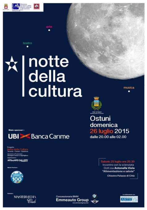 Questo fine settimana toccherà ad Ostuni, una tra le località più note e più belle della Puglia e non solo, ospitare la manifestazione della "Notte della cultura".Arte, musica, letteratura, scienza, cinema e teatro queste le sezioni movimentate. Il centro storico della "città bianca" si animerà di tantissimi eventi di qualità, con personaggi di assoluto valore, capaci di attrarre un gran numero di visitatori.