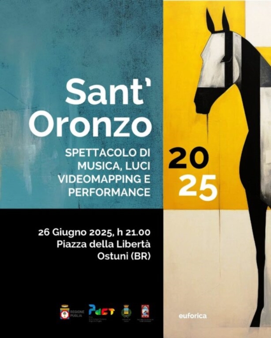 Un’anteprima straordinaria aprirà il calendario della Festa di Sant’Oronzo 2025: oggi, giovedì 26 giugno, alle ore 21:00 in Piazza della Libertà, Ostuni ospiterà uno spettacolo immersivo di musica, luci, videomapping e performance artistiche, in occasione del trentennale dell’Associazione Culturale Cavalcata di “Sant’Oronzo”.Un mix originale e coinvolgente, ideato da Euforica APS e realizzato da SIRA Videodesign, che vedrà protagonisti i Cavalieri della Cavalcata di Sant’Oronzo, l’Associazione Giovani Musicisti di Ceglie Messapica, i performer della compagnia Creatura Dance Research e l’imponente scultura in ferro dell’artista Luca Palma. Un evento unico che unisce tradizione, arte contemporanea e tecnologie multimediali, proiettando la storia di Ostuni in una dimensione nuova e suggestiva.