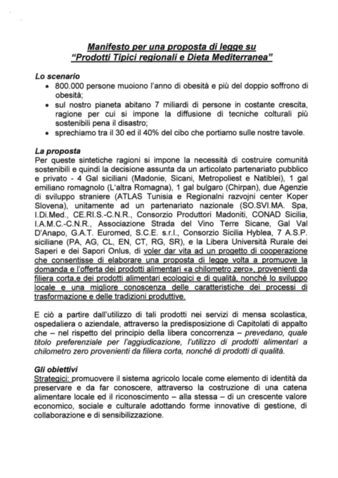 Parte dal Comune di Geraci Siculo la raccolta di firme a supporto della proposta di legge tesa a promuovere l’utilizzo di “Prodotti tipici regionali e dieta mediterranea”. Un progetto sostenuto da 4 Gal siciliani (Madonie, Sicani, Metropoliest e Natiblei), 1 gal emiliano romagnolo (L‘altra Romagna), 1 gal bulgaro (Chirpan), due Agenzie di sviluppo straniere (ATLAS Tunisia e Regionalni razvojni center Koper Slovena), unitamente ad un partenariato nazionale (SO.SVI.MA. Spa, I.Di.Med., CE.RI.S.-C.N.R., Consorzio Produttori Madoniti, CONAD Sicilia, I.A.M.C.-C.N.R., Associazione Strada del Vino Terre Sicane, Gal Val D’Anapo, G.A.T. Euromed, S.C.E. s.r.l., Consorzio Sicilia Hyblea, 7 A.S.P. siciliane (PA, AG, CL, EN, CT, RG, SR), e la Libera Università Rurale dei Saperi e dei Sapori Onlus.Si tratta di un progetto di cooperazione per consentire di elaborare una proposta di legge volta a promuove la domanda e l’offerta dei prodotti alimentari a km zero, provenienti da filiera corta, dei prodotti alimentari ecologici e di qualità, nonché lo sviluppo locale e una migliore conoscenza delle caratteristiche dei processi di trasformazione e delle tradizioni produttive.