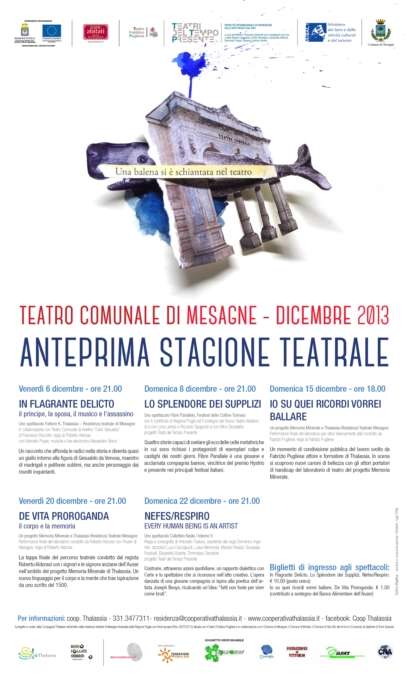 Dopo il successo del primo appuntamento “In flagrante delicto – Il principe, la sposa, il musico e l'assassino” dello scorso venerdì 6 dicembre, continua il calendario d'eccezione in programma per l'anteprima della Stagione Teatrale 2014 della Residenza Teatrale di Mesagne a cura di Thalassia, “Una balena si è schiantata nel teatro”. Il calendario degli appuntamenti è realizzato in collaborazione con l’Amministrazione Comunale di Mesagne e l’Associazione Ufficio Soggetti Smarriti. La rassegna è realizzata grazie alla virtuosa sinergia tra tre diversi progetti: il PO FESR Puglia 2007-2013 Asse IV che la Regione Puglia ha affidato al Teatro Pubblico Pugliese, il programma TEATRI ABITATI finanziato dalla stessa Regione Puglia con fondi europei (Fesr 2007/2013) e il Progetto MEMORIA MINERALE di Fondazione con il Sud già attivo sul territorio con la sua ricerca tra arte e valorizzazione urbana.