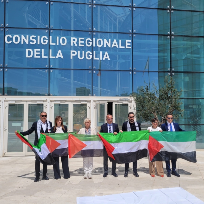 Bandiere palestinesi rovesciate nel flash mob davanti alla Regione. Mozione pro Palestina in ConsiglioBandiere palestinesi rovesciate nel flash mob tenutosi questa mattina davanti all'ingresso della sede del Consiglio regionale della Puglia, per condannare in maniera ferma lo sterminio della popolazione palestinese, ma anche per testimoniare che, in questo particolare momento storico, sono letteralmente ribaltate le priorità e cancellati i diritti umani di un intero popolo.