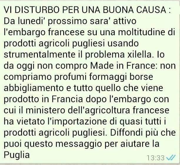 La prima fu l’Algeria che, ad inizio anno, vietò l’importazione di barbatelle, le talee della vite, dalla Puglia, poi fu la volta della Francia che pose l’embargo di ben 102 specie vegetali tra cui ulivo, vite, fico, albicocco, mandorlo, pesco, agrumi, ciliegio, gelso e numerose piante ornamentali. I territori pugliesi colpiti dal disseccamento rapido dell’olivo, oltre a dover fronteggiare l’emergenza Xylella, si sono ritrovati con innumerevoli sbocchi d’esportazione chiusi, da un giorno all’altro, per i timori degli altri Stati. Sino a configurarsi, per commercianti e produttori, una vera e propria “guerra commerciale”. Nonostante la Commissione europea abbia definito come “legittime” ed “in linea con la legislazione Ue” le misure adottate dalla Francia, non mancano comportamenti che travalicano quello che, per la scienza, è il reale e potenziale impatto del batterio Xylella.“Sono oramai incalcolabili i danni per i florovivaisti salentini colpiti dall’embargo e per gli agricoltori, i quali hanno dovuto assistere al crollo della produzione olivicola nonché al disseccamento rapido di innumerevoli olivi nei propri campi – dichiara il deputato pugliese Giuseppe L’Abbate, capogruppo M5S in Commissione Agricoltura – Probabilmente a causa di disinformazione, mancata chiarezza delle notizie e strumentalizzazioni politiche, si è assistito ad una vera e propria ‘psicosi da Xylella’. Si è, in pratica, proceduto alla equiparazione tra embargo delle importazioni di materiale vegetale, le piante, con embargo dei prodotti agricoli. In Puglia, è stato lo stesso Francesco Schittulli a lanciare la campagna #iononcomproMadeinFrance per rispondere alla presunta guerra commerciale sui prodotti agricoli pugliesi messa in atto da Parigi. Questo bailamme di dichiarazioni – continua L’Abbate (M5S) – non ha fatto altro che aumentare i timori dei Paesi importatori di prodotti agricoli della nostra regione. Molte imprese esportatrici di prodotti ortofrutticoli, infatti, lamentano la richiesta di informazioni chiare da parte dei loro clienti a cui non riescono a fornire una risposta univoca e definitiva sulla sicurezza della propria merce. Una situazione incredibile e paradossale a cui urge mettere riparo”.