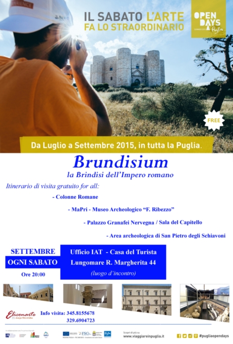 In coincidenza con le Giornate del Patrimonio 2015 e nell'ambito del progetto Puglia Open Days, il ricco calendario di aperture straordinarie e visite guidate del patrimonio culturale pugliese promosso da Regione Puglia e Pugliapromozione, l'appuntamento è alle ore 20,00 con il "Brundisium" la visita guidata del centro storico di Brindisi, partendo dall'ufficio d'informazione accoglienza turistica (IAT) presso la Casa del Turista sul lungomare Regina Margherita.