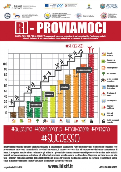 Il progetto “Ri-Proviamoci” è stato realizzato nell’ambito del Piano Azione e Coesione del Programma Operativo Nazionale 2007/2013 (PON F-3-FSE02-POR-PUGLIA-2013-51 Obiettivo F “Promuovere il successo scolastico, le pari opportunità e l’inclusione sociale” Azione 3 “Sviluppo di reti contro la dispersione scolastica e la creazione di prototipi innovativi”). Mira a realizzare e promuovere nuove metodologie educative volte a prevenire e contrastare l’abbandono e l’insuccesso scolastico, favorire l’inclusione sociale e migliorare l’autostima. Un metodo innovativo, che coinvolge insegnanti, tutor, psicologi, genitori e alunni, e che si basa sulla modalità ricerca-azione con attivazione e applicazione di una didattica per competenze, laboratoriale ed orientante.