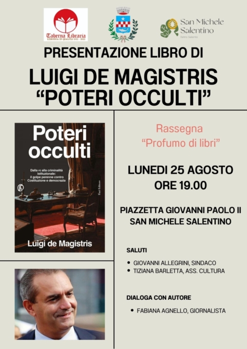 La rassegna letteraria “Profumo di libri” – inserita nel programma estivo di San Michele Salentino - accoglie un nuovo e prestigioso appuntamento con la cultura. Lunedì 25 agosto, alle ore 19:00, la Piazzetta Giovanni Paolo II ospiterà la presentazione di “Poteri occulti” di Luigi De Magistris, già magistrato e sindaco di Napoli.Si tratta di un saggio coraggioso e documentatissimo che denuncia le infiltrazioni sistemiche e le derive eversive che, da decenni, minacciano la legalità e la democrazia in Italia. Nel suo lavoro, De Magistris illumina le trame oscure che intrecciano criminalità organizzata, massonerie deviate, servizi segreti, imprenditoria, politica e persino settori della magistratura, restituendoci il quadro inquietante di una criminalità istituzionale sempre più mimetizzata nei gangli dello Stato.