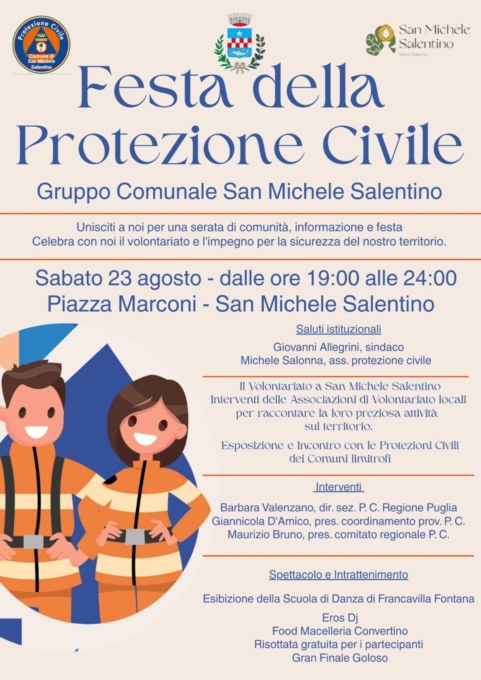 Tutto pronto a San Michele Salentino per la Festa della Protezione Civile, un appuntamento per rendere omaggio ai volontari e informare la comunità sulle attività dei vari gruppi comunali. L’iniziativa, organizzata dal Gruppo Comunale di Protezione Civile, si terrà sabato 23 agosto in Piazza Marconi, a partire dalle ore 19:00 fino a mezzanotte.La serata si aprirà con i saluti istituzionali del sindaco Giovanni Allegrini e dell’assessore alla protezione civile Michele Salonna, per poi lasciare spazio al racconto delle esperienze di volontariato presenti sul territorio. Le associazioni locali avranno infatti l’occasione di condividere con i cittadini il valore delle loro attività quotidiane a favore della sicurezza collettiva. Sarà inoltre possibile incontrare e conoscere le Protezioni Civili dei comuni limitrofi, che porteranno testimonianze e mezzi in esposizione.