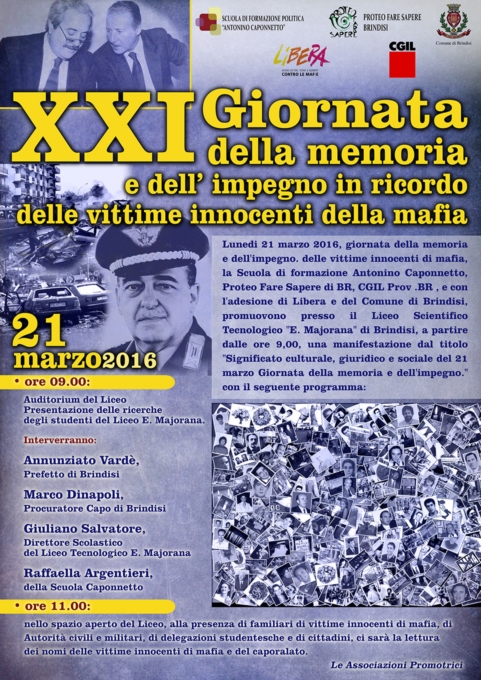 Lunedì 21 marzo 2016, giornata dell’impegno e della memoria delle vittime innocenti di mafia, la scuola di formazione “A.Caponnetto”, l’IISS ‘Ettore Majorana’ di Brindisi, Proteo Fare Sapere di Brindisi, CGIL prov. BR e con l’adesione di Libera e
