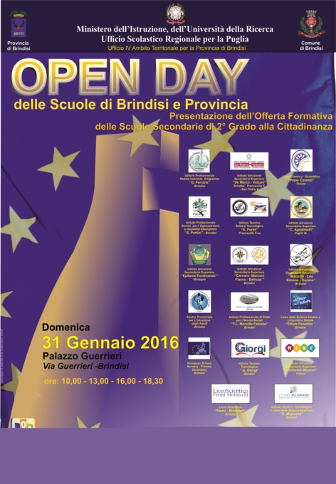 In occasione della fase di apertura delle iscrizioni per l'anno scolastico 2016/2017, dal 22 gennaio al 22 febbraio 2016, in continuità con l'anno precedente, le scuole secondarie di II grado di Brindisi e provincia, insieme all'Ufficio Scolastico Territoriale di Brindisi, promuovono l' "Open Day 2016", finalizzato alla presentazione dell'Offerta Formativa alla cittadinanza per orientare i giovani studenti, e le famiglie, ad una scelta consapevole del proprio percorso di studi, sulla base delle proprie attitudini e inclinazioni personali.L’evento ha ottenuto il patrocinio della Provincia e del Comune di Brindisi, cogliendo la valenza culturale e formativa dell'iniziativa ed esplicitando l'interesse a sostenere e promuovere il progetto. Inoltre, l’Amministrazione comunale, rispondendo alla richiesta della scuole, ha reso disponibile la sede di "Palazzo Guerrieri", luogo simbolo della città, restituito ai suoi splendori da un recente lavoro di restauro e ristrutturazione e in procinto di allestimento per il progetto BRINDISI SMART LAB, al quale anche le scuole brindisine hanno offerto il proprio contributo.
