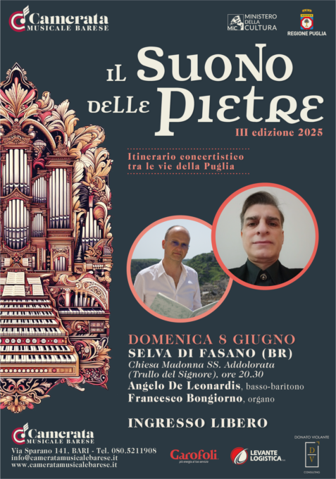 Domenica 8 giugno alle ore 20.30, nella Chiesa Maria SS.ma Addolorata – nota anche come Trullo del Signore – nel cuore della Selva di Fasano (BR), il penultimo appuntamento de Il Suono delle Pietre - Itinerario concertistico tra le vie della Puglia con la direzione artistica del M° Dino De Palma. Protagonisti del concerto “Il Suono della Bellezza. Viaggio attraverso la musica romantica mitteleuropea” saranno Angelo De Leonardis, basso-baritono dalla voce intensa e dalla straordinaria profondità interpretativa, e Francesco Bongiorno, raffinato organista di fama internazionale. Insieme condurranno il pubblico in un itinerario sonoro che attraversa la spiritualità tedesca e slava del XIX secolo, tra suggestioni liriche, introspezione e mistica bellezza.Il programma aprirà con i Vier ernste Gesänge, op. 121 di Johannes Brahms, un ciclo di Lieder sacri per voce e organo che raccoglie testi biblici dall’Ecclesiaste, dal Siracide e dalla Prima Lettera ai Corinzi, meditazioni poetiche sul senso della vita, della morte e dell’amore.