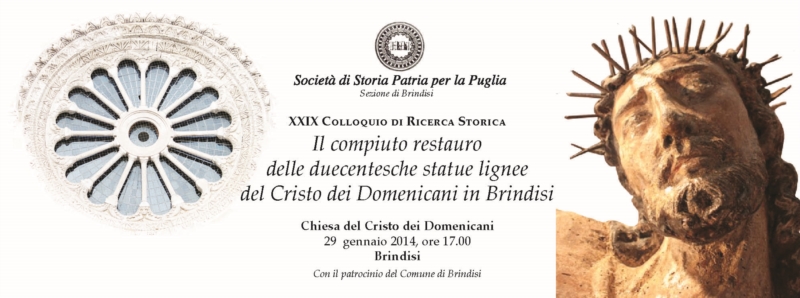 "Capitò questa sacra reliquia nella città di Brindisi per mezzo di una nave veneta venuta d’Alessandria, che si ricovrò in quel porto, fuggendo l’onde feroci dell’Adriatico. Conduceva entro di sé la nave un clarissimo venetiano, chiamato per nome Giovanni Cappello, che veniva da Gierusalemme, dove per sua devotione haveva visitato quei santi luoghi, portando con sé molte reliquie, e tra l’altre l’imagine predetta del Santissimo Crocifisso". Il prossimo 29 gennaio, con inizio alle ore 17.00, nella chiesa del Cristo, in Brindisi, sarà presentato, attraverso le relazioni di Rosa Lorusso (Soprintendenza per i Beni Storici, Artistici ed Etnoantropologici per la Puglia) Pierluigi Leone De Castris (Università Suor Orsola Banincasa, Napoli), Gaetano Curzi (Università Gabriele D'Annunzio, Pescara-Chieti), Giacomo Carito (Società di Storia Patria per la Puglia), il restauro compiuto delle due statue lignee del duecento che in quella chiesa sono conservate: il Crocefisso e la Madonna Sedes Sapientiae.