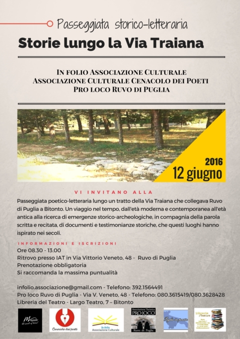 Protagonista un tratto della Via Traiana che collegava Ruvo di Puglia e Bitonto, attraversando l'attuale territorio di Terlizzi, e utilizzata nei secoli per diversi e molteplici scopi: pellegrinaggi, crociate, viaggi e scambi commerciali. Invitiamo a sospendere il sentire del tempo moderno, veloce e congestionato, e percorrere con noi in lentezza e ascolto profondo circa 8 km di questo antico e affascinante itinerario. Un viaggio nel tempo, dall'età moderna e contemporanea all'età antica, in compagnia della parola scritta di uomini e donne in cammino nel corso dei secoli. Scopriremo le emergenze storico – archeologiche presenti lungo il percorso, immagineremo i passaggi attraverso questi luoghi, le soste, i cambi, le ripartenze. Leggeremo parole in forma di poesie,lettere, diari, documenti e testimonianze storiche, che questi luoghi nei secoli hanno ispirato.