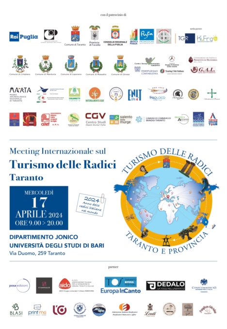 In occasione dell' "Anno delle Radici Italiane nel Mondo", designato per il 2024 dal Ministero degli Affari Esteri, il 17 aprile dalle 9:00 alle 20:00 si svolgerà a Taranto il primo Meeting internazionale sul Turismo delle Radici presso il Dipartimento Jonico dell'Università degli Studi di Bari Aldo Moro – Via Duomo 259.