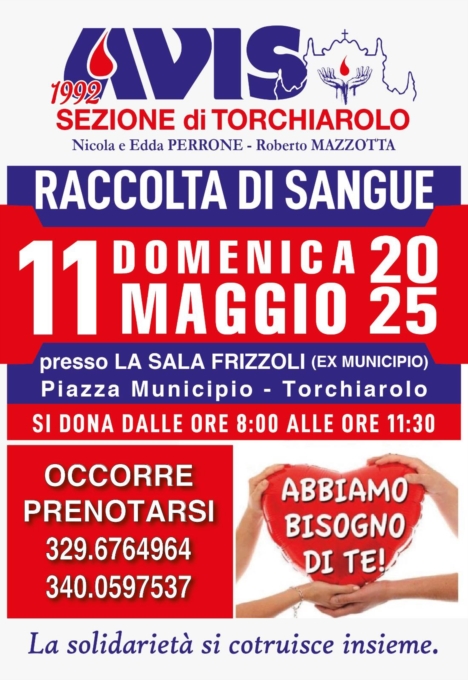 L’Avis di Torchiarolo organizza e promuove una donazione di sangue per domenica 11 maggio pv presso la sala Frizzoli (Ex Municipio) in piazza Municipio a Torchiarolo.